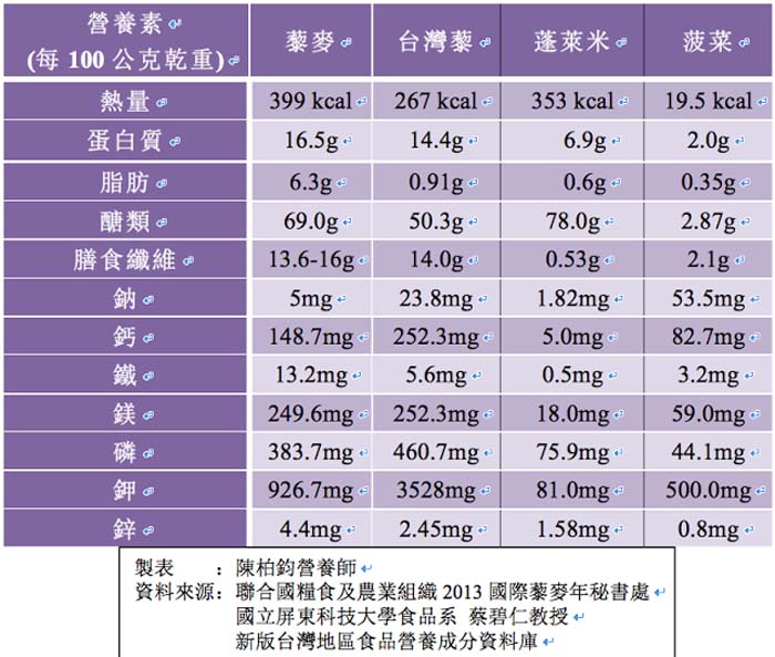 ▲各種藜麥營養素比較表。整理/陳柏鈞營養師