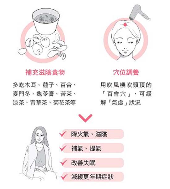 停經後的婦女陽氣相對太多、陰分不足,陽氣沒辦法全部收到陰分裡面去,身體不能安靜下來,就無法睡覺,即使睡著了也會比較淺眠、多夢。因此,想要改善停經後女性的失眠問題,就要幫身體滋陰、降火,可以適量吃些木耳、蓮子、百合、麥門冬、龜苓膏,或是喝點苦茶、涼茶、青草茶、菊花茶等,把火氣降下來、將陰分補足,到了晚上陽氣能夠全部收到陰分裡面去,就可以一夜好眠了。