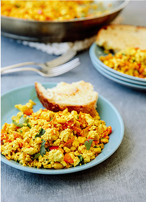 步驟1: 板豆腐壓乾( 準備一個平底小碗壓在板豆腐上,碗內可放番茄或是豆子罐頭)把水分壓乾後捏碎, 看起來像炒蛋一樣, 先炒過後備用。