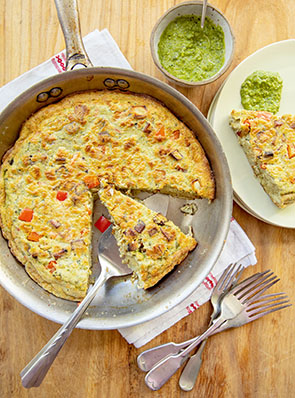 步驟4: 從烤箱取出後,靜置3-4分鐘,再用刮刀從鍋子邊緣開始將義大利烘蛋從鍋底鬆開。完成製作拉,可以沾上剩餘的青醬。